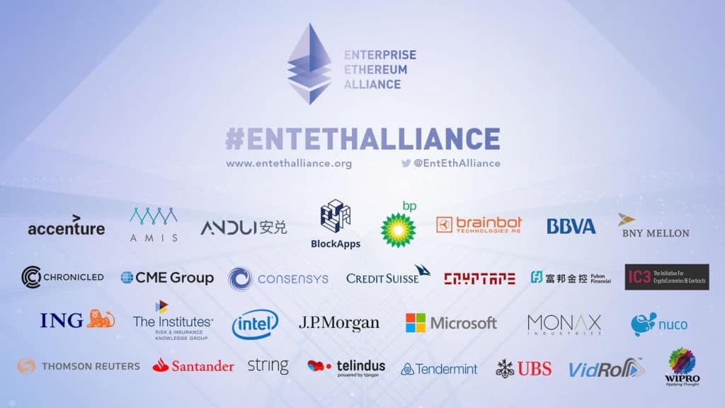 قابلیت‌های اتریوم برای استفاده از قراردادهای هوشمند، ساخت آسان توکن‌ها و استقرار DApps توجه بسیاری از شرکت‌ها را در سراسر جهان به خود جلب کرده است. این بدان معناست که توسعه اتریوم از حمایت مستقیم یا غیرمستقیم یک گروه تجاری بزرگ علاقه مند به توسعه فناوری آن برخوردار بوده است. همه این مجموعه از شرکت ها فراخوانی Ethereum Enterprise Alliance (EEA) را ایجاد کرده اند که بیش از ۱۰۰ عضو دارد. از جمله آن ها می توان به موارد زیر اشاره کرد